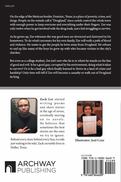 On the edge of the Mexican border, Dominic, Texas, is a place of poverty, crime, and drugs. People on the outside call it "Drugland," since cartels control the whole town with enough power to keep everyone and everything under their fingers. Zee was only twelve when he got involved with the drug trade, just a kid struggling to survive. As he grows up, Zee witnesses the way good men are devoured and destroyed in his hometown. To do what's necessary for his own family, Zee will walk a path of blood and violence. He wants to get the people he loves away from Drugland. He refuses to end up like many of the boys he grew up with who became victims to the city's clutches. But even as a college student, Zee isn't sure who he is or where he stands on the line of good and evil. Is he a good guy, corrupted by his environment, doing what it takes to survive? Or is he a bad guy who's finally learned to thrive in a land of crime and hardship? Only time will tell if Zee will become a casualty or walk out of Drugland its king.