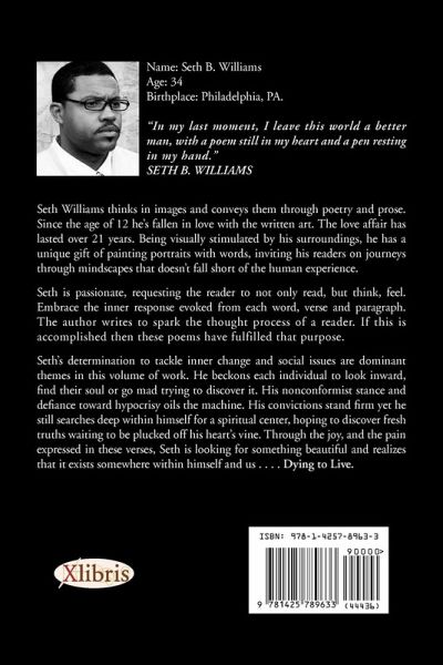 "In my last moment, I leave this world a better man, with a poem still in my heart and a pen resting in my hand." SETH B. WILLIAMS Seth Williams thinks in images and conveys them through poetry and prose. Since the age of 12 he's fallen in love with the written art. The love affair has lasted over 21 years. Being visually stimulated by his surroundings, he has a unique gift of painting portraits with words, inviting his readers on journeys through mindscapes that doesn't fall short of the human experience. Seth is passionate, requesting the reader to not only read, but think, feel. Embrace the inner response evoked from each word, verse and paragraph. The author writes to spark the thought process of a reader. If this is accomplished then these poems have fulfilled that purpose. Seth's determination to tackle inner change and social issues are dominant themes in this volume of work. He beckons each individual to look inward, find their soul or go mad trying to discover it. His nonconformist stance and defiance toward hypocrisy oils the machine. His convictions stand firm yet he still searches deep within himself for a spiritual center, hoping to discover fresh truths waiting to be plucked off his heart's vine. Through the joy, and the pain expressed in these verses, Seth is looking for something beautiful and realizes that it exists somewhere within himself and us.. Dying to Live.