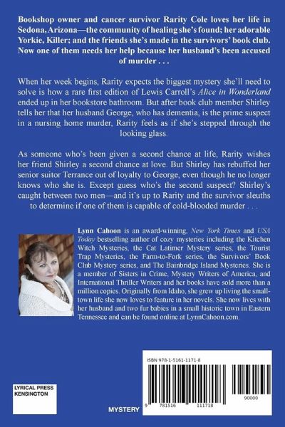 Bookshop owner and cancer survivor Rarity Cole loves her life in Sedona, Arizona--the community of healing she's found; her adorable Yorkie, Killer; and the friends she's made in the survivors' book club. Now one of them needs her help because her husband's been accused of murder . . . When her week begins, Rarity expects the biggest mystery she'll need to solve is how a rare first edition of Lewis Carroll's Alice in Wonderland ended up in her bookstore bathroom. But after book club member Shirley tells her that her husband George, who has dementia, is the prime suspect in a nursing home murder, Rarity feels as if she's stepped through the looking glass. As someone who's been given a second chance at life, Rarity wishes her friend Shirley a second chance at love. But Shirley has rebuffed her senior suitor Terrance out of loyalty to George, even though he no longer knows who she is. Except guess who's the second suspect? Shirley's caught between two men--and it's up to Rarity and the survivor sleuths to determine if one of them is capable of cold-blooded murder . . .