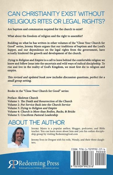 Can Christianity exist without religious rites or legal rights? Are baptism and communion required for the church to exist? What about the freedom of religion and the right to assemble? Building on what he has written in other volumes of the "Close Your Church for Good" series, Jeremy Myers argues that our traditions of baptism and the Lord's Supper, and our dependence on the legal rights from the government, have actually hindered the growth and development of the church. Dying to Religion and Empire is a call to leave behind the comfortable religion we know and follow Jesus into the uncertain and wild ways of radical discipleship. To rise and live in the reality of God's Kingdom, we must first die to religion and empire. This revised and updated book now includes discussion questions, perfect for a small group setting. Books in the "Close Your Church for Good" series: Preface: Skeleton Church Volume 1: The Death and Resurrection of the Church Volume 2: Put Service Back into the Church Service Volume 3: Dying to Religion and Empire Volume 4: Church is More than Bodies, Bucks, & Bricks Volume 5: Cruciform Pastoral Leadership