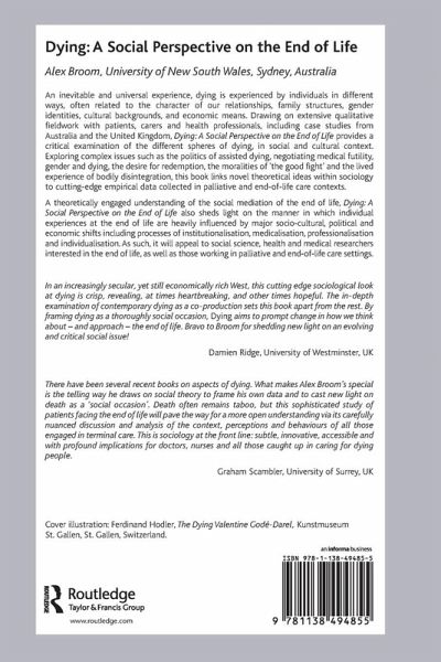 An inevitable and universal experience, dying is experienced by individuals in different ways, often related to the character of our relationships, family structures, gender identities, cultural backgrounds, and economic means. Drawing on extensive qualitative fieldwork with patients, carers and health professionals in Australia and the United Kingdom, Dying: A Social Perspective on the End of Life provides a critical examination of the different spheres of dying, in social and cultural context. Exploring complex issues such as the politics of assisted dying, negotiating medical futility, gender and dying, the desire for redemption, the moralities of 'the good fight' and the lived experience of bodily disintegration, this book links novel theoretical ideas within sociology to cutting-edge empirical data collected in palliative and end-of-life care contexts. A theoretically engaged understanding of the social mediation of the end of life, Dying: A Social Perspective on the End of Life also sheds light on the manner in which the end of life can be shaped by major economic, cultural and socio-cultural shifts including neo-liberalism, individualisation, medicalisation, professionalisation and detraditionalisation. As such, it will appeal to social science, health and medical researchers interested in the end of life, as well as those working in palliative and end-of-life care settings.