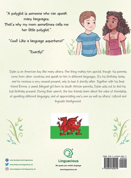 Little Polyglot Adventures Series (Vol. 1): Dylan's Birthday Present / Anrheg Penblwydd Dylan - Bilingual Welsh and English Children's Picture Book This is the bilingual Welsh - English edition of this children's picture book. It is also available in several other languages, including in bilingual versions. Summary in English: Dylan is an American boy like many others. One thing makes him special, though: his parents come from other countries and speak to him in different languages. It's his birthday today and he receives a very unusual present, only to lose it shortly after. Together with his best friend Emma, a sweet bilingual girl born to South African parents, Dylan sets out to find his lost birthday present. During their search, the two friends learn about the value of friendship, of speaking different languages, and of appreciating one's own as well as others' cultural and linguistic background. If you are looking for a children's book that will help your child see the value in speaking other languages, in being multicultural, and that will hopefully get them excited about learning languages, this book is a great choice. Summary in Welsh: Mae Dylan yn fachgen Americanaidd fel nifer eraill. Ond mae un peth yn ei wneud e'n arbennig: bod ei rhieni yn dod o wledydd eraill ac yn siarad gydag e mewn ieithoedd gwahanol. Ei benblwydd e yw hi heddiw ac mae e'n derbyn anrheg anarferol iawn, ond i'w golli yn fuan wedyn. Gyda'i ffrind gorau Emma, merch annwyl ddwyieithog gyda rhieni o De Affrica, mae Dylan yn mynd ati i ddod o hyd i'w anrheg coll. Yn ystod eu chwilio, mae'r dau ffrind yn dysgu am werth cyfeillgarwch, siarad ieithoedd gwahanol a gwerthfawrogi cefndir diwyllianol a ieithyddol eu hun ynghyd a rhai phobl eraill.