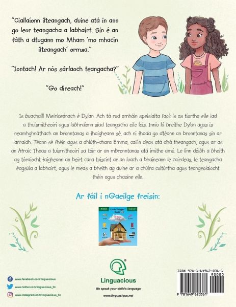 "A sweet and colorful picture book with a positive message about our multicultural, multilingual world that will appeal to all language-loving families." -- Adam Beck, author of "Maximize Your Child's Bilingual Ability" "This book should be on bookshelves in every multilingual home, to help empower kids and develop their 'superpower' of speaking in different languages." -- Shelley Admont, award-winning author, KidKiddos Books "Elementary school children everywhere will enjoy re-reading this story over and over again." -- Nikki PrSa (American polyglot) ¿ Awards ¿:1st Place: Best Illustrations (Purple Dragonfly Award) 1st Place: Cultural Diversity (Purple Dragonfly Award) Golden Award (Mom's Choice Award) Honorable Mention: Picture Books 5 & Younger (Purple Dragonfly Award) Brain Child Book Award (Tillywig Award) Little Polyglot Adventures Series (Vol. 1): Dylan's Birthday Present / Bronntanas do Bhreithlá Dylan - Irish Children's Book This is the Irish edition of this children's book. It is also available in several other languages, in both monolingual and bilingual versions. Summary in English: Dylan is an American boy like many others. One thing makes him special, though: his parents come from other countries and speak to him in different languages. It's his birthday today and he receives a very unusual present, only to lose it shortly after. Together with his best friend Emma, a sweet bilingual girl born to South African parents, Dylan sets out to find his lost birthday present. During their search, the two friends learn about the value of friendship, of speaking different languages, and of appreciating one's own as well as others' cultural and linguistic background. If you are looking for a children's book in Irish that will help your child see the value in speaking other languages, in being multicultural, and that will hopefully get them excited about learning languages, this book is a great choice. Summary in Irish (Gaeilge): Is buachaill Meiriceánach é Dylan. Ach tá rud amháin speisialta faoi: is as tíortha eile iad a thuismitheoirí agus labhraíonn siad teangacha eile leis. Inniu lá breithe Dylan agus is neamhghnáthach an bronntanas a fhaigheann sé, ach ní fhada go dtéann an bronntanas sin ar iarraidh. Téann sé fhéin agus a dhlúth-chara Emma, cailín deas atá dhá theangach, agus ar as an Afraic Theas a tuismitheoirí sa tóir ar an mbronntanas atá imithe amú. Le linn dóibh a bheith ag tóraíocht faigheann an beirt cara tuiscint ar an luach a bhaineann le cairdeas, le teangacha éagsúla a labhairt, agus le meas a bheith ag duine ar a chúlra cultúrtha agus teangeolaíocht fhéin agus dhaoine eile.
