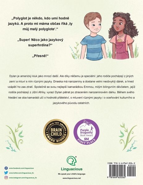 "A sweet and colorful picture book with a positive message about our multicultural, multilingual world that will appeal to all language-loving families." -- Adam Beck, author of "Maximize Your Child's Bilingual Ability" "This book should be on bookshelves in every multilingual home, to help empower kids and develop their 'superpower' of speaking in different languages." -- Shelley Admont, award-winning author, KidKiddos Books "Elementary school children everywhere will enjoy re-reading this story over and over again." -- Nikki PrSa (American polyglot) ¿ Awards ¿:1st Place: Best Illustrations (Purple Dragonfly Award) 1st Place: Cultural Diversity (Purple Dragonfly Award) Golden Award (Mom's Choice Award) Honorable Mention: Picture Books 5 & Younger (Purple Dragonfly Award) Brain Child Book Award (Tillywig Award) Little Polyglot Adventures Series (Vol. 1): Dylan's Birthday Present / Dárek pro Dylana - Czech Children's Book This is the Czech (CeStina) edition of this children's book. It is also available in several other languages, in both monolingual and bilingual versions. Summary in English: Dylan is an American boy like many others. One thing makes him special, though: his parents come from other countries and speak to him in different languages. It's his birthday today and he receives a very unusual present, only to lose it shortly after. Together with his best friend Emma, a sweet bilingual girl born to South African parents, Dylan sets out to find his lost birthday present. During their search, the two friends learn about the value of friendship, of speaking different languages, and of appreciating one's own as well as others' cultural and linguistic background. If you are looking for a Czech children's book that will help your child see the value in speaking other languages, in being multicultural, and that will hopefully get them excited about learning languages, this book is a great choice. Summary in Czech: Dylan je americký kluk jako mnozí dalSí. Ale díky necemu je speciální: jeho rodice pocházejí z jiných zemí a mluví s ním ruznými jazyky. Dneska má narozeniny a dostane velmi neobvyklý dárek, a hned vzápetí ho zas ztratí. Spolecne se svou nejlepSí kamarádkou Emmou, milým bilingvním devcetem, jejíz rodice pocházejí z Jizní Afriky, vyrazí Dylan pátrat po ztraceném narozeninovém dárku. Behem svého hledání se oba kamarádi ucí o hodnote prátelství, o mluvení ruznými jazyky i o ocenování kulturního a jazykového puvodu ostatních.
