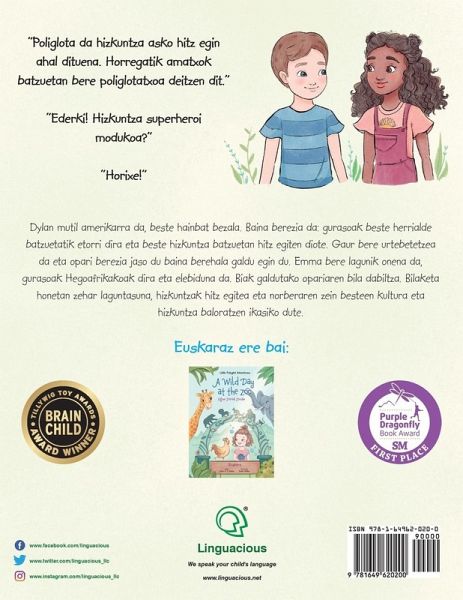 "A sweet and colorful picture book with a positive message about our multicultural, multilingual world that will appeal to all language-loving families." -- Adam Beck, author of "Maximize Your Child's Bilingual Ability" "This book should be on bookshelves in every multilingual home, to help empower kids and develop their 'superpower' of speaking in different languages." -- Shelley Admont, award-winning author, KidKiddos Books "Elementary school children everywhere will enjoy re-reading this story over and over again." -- Nikki PrSa (American polyglot) ¿ Awards ¿:1st Place: Best Illustrations (Purple Dragonfly Award) 1st Place: Cultural Diversity (Purple Dragonfly Award) Golden Award (Mom's Choice Award) Honorable Mention: Picture Books 5 & Younger (Purple Dragonfly Award) Brain Child Book Award (Tillywig Award) Little Polyglot Adventures Series (Vol. 1): Dylan's Birthday Present / Dylanen urtebetetze oparia - Basque Children's Book This is the Basque (Euskara) edition of this children's book. It is also available in several other languages, in both monolingual and bilingual versions. Summary in English: Dylan is an American boy like many others. One thing makes him special, though: his parents come from other countries and speak to him in different languages. It's his birthday today and he receives a very unusual present, only to lose it shortly after. Together with his best friend Emma, a sweet bilingual girl born to South African parents, Dylan sets out to find his lost birthday present. During their search, the two friends learn about the value of friendship, of speaking different languages, and of appreciating one's own as well as others' cultural and linguistic background. If you are looking for a Basque children's book that will help your child see the value in speaking other languages, in being multicultural, and that will hopefully get them excited about learning languages, this book is a great choice. Summary in Basque (Euskara): Dylan mutil amerikarra da, beste hainbat bezala. Baina berezia da: bere gurasoak beste herrialde batzuetatik etorri dira eta beste hizkuntza batzuetan hitz egiten diote. Gaur bere urtebetetzea da eta opari berezia jaso du baina berehala galdu egin du. Emma bere lagunik onena da, gurasoak Hegoafrikakoak dira eta elebiduna da. Biak galdutako opari bila dabiltza. Bilaketa honetan zehar laguntasuna, hizkuntzak hitz egitea eta norberaren zein besteen kultura eta hizkuntzaren jakintza baloratzen ikasten dute.