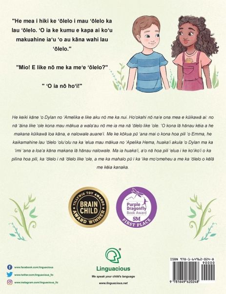 "A sweet and colorful picture book with a positive message about our multicultural, multilingual world that will appeal to all language-loving families." -- Adam Beck, author of "Maximize Your Child's Bilingual Ability" "This book should be on bookshelves in every multilingual home, to help empower kids and develop their 'superpower' of speaking in different languages.¿" -- Shelley Admont, award-winning author, KidKiddos Books "Elementary school children everywhere will enjoy re-reading this story over and over again." -- Nikki PrSa (American polyglot) ¿ Awards ¿:1st Place: Best Illustrations (2020 Purple Dragonfly Award) 1st Place: Cultural Diversity (2020 Purple Dragonfly Award) Golden Award (2020 Mom's Choice Award) Honorable Mention: Picture Books 5 & Younger (2020 Purple Dragonfly Award) Brain Child Book Award (2020 Tillywig Award) Little Polyglot Adventures Series (Vol. 1): Dylan's Birthday Present / Ka Dylan Makana La Hanau - Hawaiian Children's Book This is the Hawaiian edition of this children's book. It is also available in several other languages, in both monolingual and bilingual versions. Summary in English: Dylan is an American boy like many others. One thing makes him special, though: his parents come from other countries and speak to him in different languages. It's his birthday today and he receives a very unusual present, only to lose it shortly after. Together with his best friend Emma, a sweet bilingual girl born to South African parents, Dylan sets out to find his lost birthday present. During their search, the two friends learn about the value of friendship, of speaking different languages, and of appreciating one's own as well as others' cultural and linguistic background. If you are looking for a Hawaiian children's book that will help your child see the value in speaking other languages, in being multicultural, and that will hopefully get them excited about learning languages, this book is a great choice. Summary in Hawaiian (¿Olelo Hawai¿i): He keiki kane ¿o Dylan no ¿Amelika e like aku no me ka nui. Ho¿okahi no na¿e ona mea e kuikawa ai: no na ¿aina like ¿ole kona mau makua a wala¿au no me ia ma na ¿olelo like ¿ole. ¿O kona la hanau keia a he makana kuikawa loa kana, e nalowale auane¿i. Me ke kokua pu ¿ana mai o kona hoa pili ¿o Emma, he kaikamahine lau ¿olelo ¿olu¿olu na ka ¿elua mau makua no ¿Apelika Hema, huaka¿i akula ¿o Dylan ma ka ¿imi ¿ana a loa¿a kana makana la hanau nalowale. Ma ia huaka¿i, a¿o na hoa pili ¿elua i ke ko¿iko¿i o ka pilina hoa pili, ka ¿olelo i na ¿olelo like ¿ole, a me ka mahalo pu i ka ¿ike mo¿omeheu a me ka ¿olelo o kela me keia kanaka.