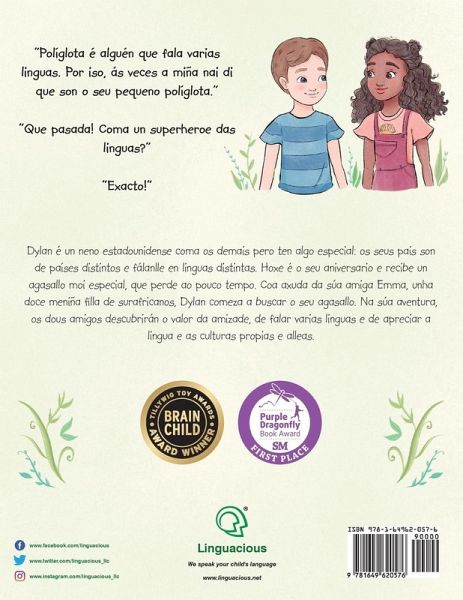 ¿ WINNER OF THE 2020 PURPLE DRAGONFLY CHILDREN'S BOOK CULTURAL DIVERSITY AWARD ¿ "A sweet and colorful picture book with a positive message about our multicultural, multilingual world that will appeal to all language-loving families." -- Adam Beck, author of "Maximize Your Child's Bilingual Ability" "This book should be on bookshelves in every multilingual home, to help empower kids and develop their 'superpower' of speaking in different languages." -- Shelley Admont, award-winning author, KidKiddos Books "Elementary school children everywhere will enjoy re-reading this story over and over again." -- Nikki PrSa (American polyglot) ¿ Awards ¿:1st Place: Cultural Diversity (Purple Dragonfly Award, 2020) 1st Place: Best Illustrations (Purple Dragonfly Award, 2020) Silver Medal in Children - Concept genre (Readers' Favorite Award, 2020) Golden Award (Mom's Choice Award, 2020) Smart Book Award (Academics' Choice, 2020) Brain Child Book Award (Tillywig Award, 2020) Honorable Mention: Picture Books 5 & Younger (Purple Dragonfly Award, 2020) Finalist: Children's Picture Book (American Fiction Awards, 2020) Little Polyglot Adventures Series (Vol. 1): Dylan's Birthday Present / O Agasallo de Aniversario de Dylan - Galician Children's Picture Book This is the Galician edition of this book. It is also available in several other languages, including in bilingual versions. Summary in English: Dylan is an American boy like many others. One thing makes him special, though: his parents come from other countries and speak to him in different languages. It's his birthday today and he receives a very unusual present, only to lose it shortly after. Together with his best friend Emma, a sweet bilingual girl born to South African parents, Dylan sets out to find his lost birthday present. During their search, the two friends learn about the value of friendship, of speaking different languages, and of appreciating one's own as well as others' cultural and linguistic background. While reading this book, children will learn new words in different languages and feel like little polyglots! If you are looking for a children's book that will help your child see the value in speaking other languages, in being multicultural, and that will hopefully get them excited about learning languages, this book is a great choice. ¿If you liked this book, don't forget to check out its coloring book companion (sold separately) and its audiobook version (sold separately).¿ Summary in Galician: Dylan é un neno estadounidense coma os demais pero ten algo especial: os seus pais son de países distintos e fálanlle en linguas distintas. Hoxe é o seu aniversario e recibe un agasallo moi especial, que perde ao pouco tempo. Coa axuda da súa amiga Emma, unha doce meniña filla de surafricanos, Dylan comeza a buscar o seu agasallo. Na súa aventura, os dous amigos descubrirán o valor da amizade, de falar varias linguas e de apreciar a lingua e as culturas propias e alleas.