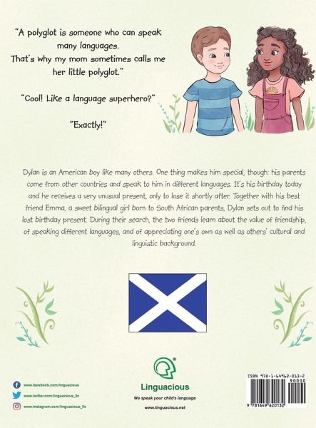 "A sweet and colorful picture book with a positive message about our multicultural, multilingual world that will appeal to all language-loving families." -- Adam Beck, author of "Maximize Your Child's Bilingual Ability" "This book should be on bookshelves in every multilingual home, to help empower kids and develop their 'superpower' of speaking in different languages.¿" -- Shelley Admont, award-winning author, KidKiddos Books "Elementary school children everywhere will enjoy re-reading this story over and over again." -- Nikki PrSa (American polyglot) ¿ Awards ¿: 1st Place: Best Illustrations (Purple Dragonfly Award) 1st Place: Cultural Diversity (Purple Dragonfly Award) Golden Award (Mom's Choice Award) Honorable Mention: Picture Books 5 & Younger (Purple Dragonfly Award) Brain Child Book Award (Tillywig Award) Little Polyglot Adventures Series (Vol. 1): Dylan's Birthday Present / Prèasant Co-latha Breith Dylan¿ - Bilingual Scottish Gaelic and English Edition This is the bilingual Scottish Gaelic and English edition of this children's book. It is also available in several other languages, in both monolingual and bilingual versions. Summary in English: Dylan is an American boy like many others. One thing makes him special, though: his parents come from other countries and speak to him in different languages. It's his birthday today and he receives a very unusual present, only to lose it shortly after. Together with his best friend Emma, a sweet bilingual girl born to South African parents, Dylan sets out to find his lost birthday present. During their search, the two friends learn about the value of friendship, of speaking different languages, and of appreciating one's own as well as others' cultural and linguistic background. If you are looking for a bilingual children's book in Scottish Gaelic that will help your child see the value in speaking other languages, in being multicultural, and that will hopefully get them excited about learning languages, this book is a great choice. Summary in Scottish Gaelic: Is e balach Ameireaganach coltach ri mòran eile a th' ann an Dylan. Tha aon rud ga fhàgail air leth bho chàch ge-tà: 's e sin gum buin a phàrantan do dhùthchannan eile agus gu bheil iad a' bruidhinn ris ann an cànanan eadar-dhealaichte. Is e an-diugh a cho-latha-breith agus tha e a' faighinn prèasant fìor annasach a tha a' dol air chall greiseag an dèidh sin. Còmhla ris a' charaid as fheàrr aige, Emma - caileag shnog dhà-chànanach aig a bheil pàrantan à Afraga a Deas - tha Dylan a' dol an lorg air a' phrèasant cho-latha-bhreith. Air an slighe, tha an dà charaid ag ionnsachadh mu luach càirdeis, comas-bruidhne ann an cànanan eadar-dhealaichte, agus mu bhith a' cur suim anns an dualchas is na cànanan aca fhèin agus aig càch.