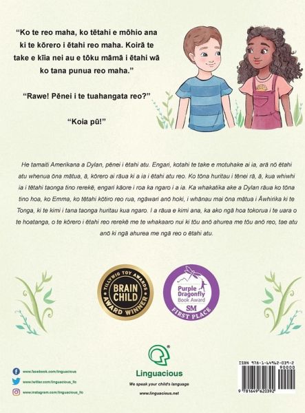 "A friendly approach to the pleasures of multilingualism" -- Kirkus Reviews "This book should be on bookshelves in every multilingual home, to help empower kids and develop their 'superpower' of speaking in different languages." -- Shelley Admont, award-winning author, KidKiddos Books "Elementary school children everywhere will enjoy re-reading this story over and over again." -- Nikki PrSa (American polyglot) ¿ Awards ¿:1st Place: Best Illustrations (Purple Dragonfly Award) 1st Place: Cultural Diversity (Purple Dragonfly Award) Golden Award (Mom's Choice Award) Honorable Mention: Picture Books 5 & Younger (Purple Dragonfly Award) Brain Child Book Award (Tillywig Award) Little Polyglot Adventures Series (Vol. 1): Dylan's Birthday Present / Te taonga huritau a Dylan - Maori Children's Book This is the Maori (Te Reo Maori) edition of this children's book. It is also available in several other languages, in both monolingual and bilingual versions. Summary in English: Dylan is an American boy like many others. One thing makes him special, though: his parents come from other countries and speak to him in different languages. It's his birthday today and he receives a very unusual present, only to lose it shortly after. Together with his best friend Emma, a sweet bilingual girl born to South African parents, Dylan sets out to find his lost birthday present. During their search, the two friends learn about the value of friendship, of speaking different languages, and of appreciating one's own as well as others' cultural and linguistic background. If you are looking for a children's book in Maori that will help your child see the value in speaking other languages, in being multicultural, and that will hopefully get them excited about learning languages, this book is a great choice. Summary in Maori (Te Reo Maori): He tamaiti Amerikana a Dylan, penei i etahi atu. Engari, kotahi te take e motuhake ai ia, ara no etahi atu whenua ona matua, a, korero ai raua ki a ia i etahi atu reo. Ko tona huritau i tenei ra, a, kua whiwhi ia i tetahi taonga tino rereke, engari kaore i roa ka ngaro i a ia. Ka whakatika ake a Dylan raua ko tona tino hoa, ko Emma, ko tetahi kotiro reo rua, ngawari ano hoki, i whanau mai ona matua i Awhirika ki te Tonga, ki te kimi i tana taonga huritau kua ngaro. I a raua e kimi ana, ka ako nga hoa tokorua i te uara o te hoatanga, o te korero i etahi reo rereke me te whakaaro nui ki tou ano ahurea me tou ano reo, tae atu ano ki nga ahurea me nga reo o etahi atu.