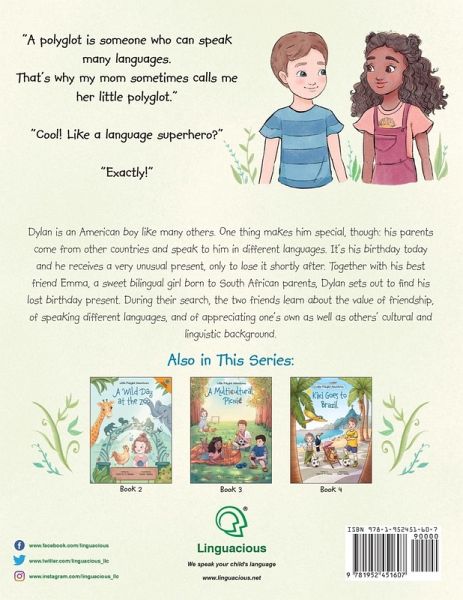 Little Polyglot Adventures Series (Vol. 1): Dylan's Birthday Present This is the English (original) version of this book. It is also available in several other languages, including in bilingual versions. Dylan is an American boy like many others. One thing makes him special, though: his parents come from other countries and speak to him in different languages. It's his birthday today and he receives a very unusual present, only to lose it shortly after. Together with his best friend Emma, a sweet bilingual girl born to South African parents, Dylan sets out to find his lost birthday present. During their search, the two friends learn about the value of friendship, of speaking different languages, and of appreciating one's own as well as others' cultural and linguistic background. If you are looking for a children's book that will help your child see the value in speaking other languages and hopefully get more excited about learning one, this book is a great choice. Lexile Reading Level: 520L