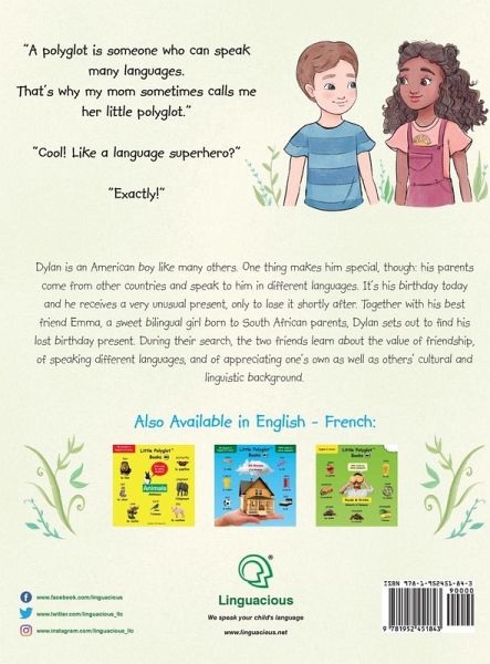 Little Polyglot Adventures Series (Vol. 1): Dylan's Birthday Present / Le cadeau d'anniversaire de Dylan - Bilingual French & English Edition This is the bilingual French & English edition of this book. It is also available in several other languages, including in bilingual versions. Summary in English: Dylan is an American boy like many others. One thing makes him special, though: his parents come from other countries and speak to him in different languages. It's his birthday today and he receives a very unusual present, only to lose it shortly after. Together with his best friend Emma, a sweet bilingual girl born to South African parents, Dylan sets out to find his lost birthday present. During their search, the two friends learn about the value of friendship, of speaking different languages, and of appreciating one's own as well as others' cultural and linguistic background. If you are looking for a children's book that will help your child see the value in speaking other languages, in being multicultural, and that will hopefully get them excited about learning languages, this book is a great choice. Summary in French: Dylan est un garçon américain comme tant d'autres. Une chose le rend cependant spécial¿: ses parents sont originaires d'autres pays et lui parlent en plusieurs langues. C'est son anniversaire aujourd'hui, et il reçoit un cadeau qui sort vraiment de l'ordinaire, qu'il perdra quelques instants plus tard. Accompagné de sa meilleure amie Emma, une fille mignonne aux parents sudafricains, Dylan part à la recherche de son cadeau d'anniversaire perdu. Au cours de leur recherche, ces deux amis apprennent la valeur de l'amitié, de parler plusieurs langues, et d'apprécier la culture et la langue des autres ainsi que la sienne.