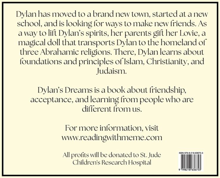 Dylan has moved to a brand new town, started at a new school, and is overcome by loneliness. As a way to lift Dylan's spirits, a special gift is given. Lovie is a magical doll that transports Dylan to the homeland of three Abrahamic religions, where Dylan learns about the Holy Sites, foundations, and principles of Islam, Christianity, and Judaism. We watch Dylan grow from a sad and quiet child into a happy and friendly playmate. Dylan's Dreams is a book about friendship, acceptance, and learning about people who are different from us.