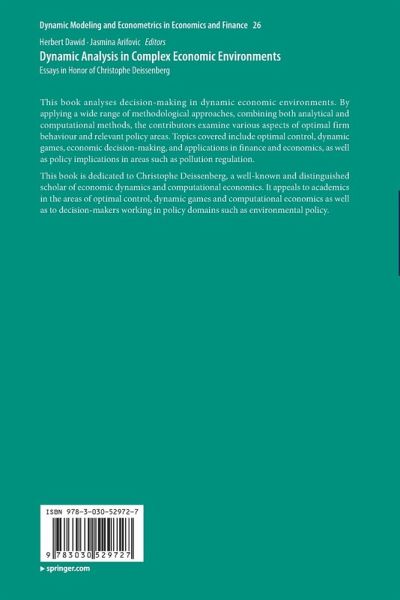 This book analyses decision-making in dynamic economic environments. By applying a wide range of methodological approaches, combining both analytical and computational methods, the contributors examine various aspects of optimal firm behaviour and relevant policy areas. Topics covered include optimal control, dynamic games, economic decision-making, and applications in finance and economics, as well as policy implications in areas such as pollution regulation.