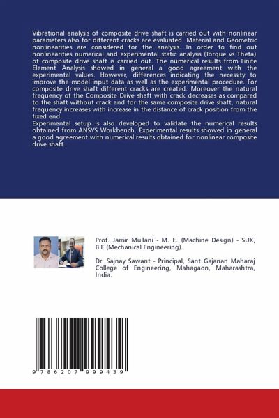 Vibrational analysis of composite drive shaft is carried out with nonlinear parameters also for different cracks are evaluated. Material and Geometric nonlinearities are considered for the analysis. In order to find out nonlinearities numerical and experimental static analysis (Torque vs Theta) of composite drive shaft is carried out. The numerical results from Finite Element Analysis showed in general a good agreement with the experimental values. However, differences indicating the necessity to improve the model input data as well as the experimental procedure. For composite drive shaft different cracks are created. Moreover the natural frequency of the Composite Drive shaft with crack decreases as compared to the shaft without crack and for the same composite drive shaft, natural frequency increases with increase in the distance of crack position from the fixed end.Experimental setup is also developed to validate the numerical results obtained from ANSYS Workbench. Experimental results showed in general a good agreement with numerical results obtained for nonlinear composite drive shaft.