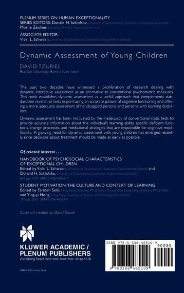 "This book is a must read for graduate student, scholar, or practitioner in psychoeducational assessment. At the least, it will provide an introduction to dynamic assessment, and at the most it will change one's philosophy of cognitive measurement." (Choice, 39:6 (2002) "...superbly focused and densely packed with helpful information for any educational or clinical psychologist or researcher seeking a comprehensive introduction to the theory and practice of dynamic assessment. [...] Tzuriel provides an excellent overview of much of the key research into the validity, reliability and overall value of dynamic assessment whilst at the same time confronting many of its most powerful critics with logical and carefully balanced rebuttals. ...will come to be considered a standard classic in this field and I have no hesitation in recommending it to anyone seeking an accessible introduction to the static vs dynamic assessment debate." (Professor Robert Burden in British Journal of Educational Psychology) "An important contribution to dynamic assessment are Tzuriels DA tests for younger children, which are based directly on Feuerstein's theories... The book is a timely and welcome summary of Tzurieltensive involvement in DA. Tzuriel has opened up a lot of lines of investigation, and the many unanswered questions invite future research, in DA test development as well as in applications of DA to school achievement, and in the prevention of failure for at-risk children." (Ruth Deutsch in  Journal of Cognitive Education and Psychology, 2:3 (December 2002) "...Highly readable and accesible to a broad audience. [...] Tzuriel achieves the goals of presenting both current theory and clinical applications. He effectively interweaves research and practice in a way that provides detailed information about experimental studies while simultaneously explaining real-life applications of the work." ( Elizabeth D. Peña in Journal of Psychoeducational Assessment, 22 (2004)