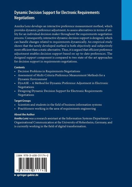 Annika Lenz develops an interactive preference measurement method, which provides dynamic preference adjustment, to assess alternatives in terms of utility for an individual decision maker throughout the requirements negotiation process. Consequently, interactive dynamic decision support is designed, which can handle changes related to requirements dynamically. An empirical study shows that the newly developed method is both objectively and subjectively more efficient than a static alternative. Thus, it is argued that efficient preference adjustment enables decision support based on up-to-date preferences. The designed support component is compared to two state-of-the-art approaches for decision support in requirements negotiations.