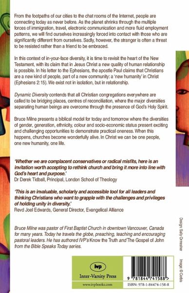 From the footpaths of our cities to the chat rooms of the Internet, people are connecting today as never before. As the planet shrinks through the multiple forces of immigration, travel, electronic communication and more fluid employment patterns, we will find ourselves increasingly forced into contact with those who are significantly different from ourselves. Sadly however, the stranger is often a threat to be resisted rather than a friend to be embraced. In this context of in-your-face diversity, it is time to revisit the heart of the New Testament, with its claim that in Jesus Christ a new quality of human relationship is possible. In his letter to the Ephesians, the apostle Paul claims that Christians are a new kind of people, part of a new community: a 'new humanity' in Christ (Ephesians 2:15). We exist not in isolation, but in relationship. 'Dynamic Diversity' contends that all Christian congregations everywhere are called to be bridging places, centres of reconciliation, where the major diversities separating human beings are overcome through the presence of God's Holy Spirit. Bruce Milne presents a biblical model for today and tomorrow where the diversities of gender, generation, ethnicity, colour and socio-economic status present exciting and challenging opportunities to demonstrate practical oneness. When this happens, churches become wonderfully alive. In Christ we can be one people, one new humanity, one life.
