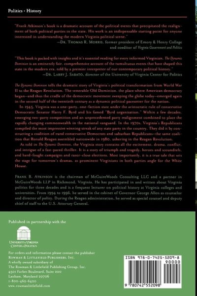 The Dynamic Dominion tells the dramatic story of Virginia's political transformation from the Second World War to the Reagan Revolution. The cradle of American democracy - and thus of the democratic movement that is sweeping the globe today - the venerable Old Dominion has emerged again in the second half of the 20th century as a dynamic political pace setter for the nation. In 1945, Virginia was a one-party, one-faction state under the aristocratic rule of conservative Democratic Senator Harry F. Byrd and his famed 'Byrd organization.' From his perch as the uncontested leader of the state that led the south, Virginia's Byrd became a regional symbol, a congressional kingpin, and a national power. With its political system and culture static, Virginia's voice was heard nationally mostly in dissent, as it had been for a century. Within a few decades, emerging two-party competition and an unprecedented party realignment combined to place the rapidly changing commonwealth in the national vanguard. Well before Republican parties throughout the South became competitive, Virginia's Republicans in the 1970s compiled the most impressive winning streak of any state party in the country. They did it by constructing a coalition of rural conservative Democrats and suburban Republicans - the same coalition that Ronald Reagan assembled nationwide in 1980, ushering in the Reagan Revolution. As told in The Dynamic Dominion, the Virginia story contains all the excitement, drama, conflict, and intrigue of a fast-paced thriller. It is a story of triumph and tragedy, celebrities and statesmen, heroes and scoundrels - of shifting party loyalties and makeshift coalitions, hard-fought campaigns and razor-close elections - of ambition and cynicism alongside sacrifice and idealism. Best of all, the tale is true. It is the fascinating story of contemporary democracy flourishing in Virginia . . . the place where it was born.