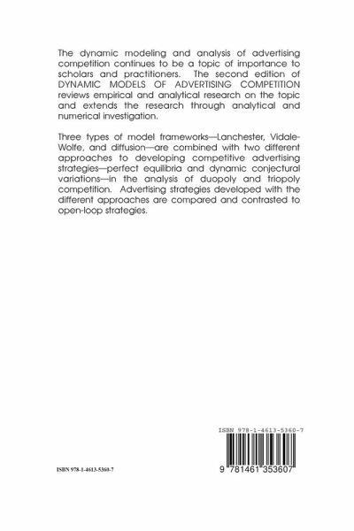 I am gratified that there is sufficient interest in the subject matter so as to support the offering of a second edition of this monograph. The of differential games dynamic interpretation and game theoretic foundation form a powerful and vital methodology for helping us study and understand marketing competition. This second edition offers a blend of what proved to be successful with the first edition and new material. The first two chapters, reviewing empirical and modeling research, have been updated to include contributions in the last decade that have advanced the area. I have not changed the essential content in the duopoly analyses in chapters 3, 4, and 5. A notable addition to the present edition are the new chapters, 6, 7, and 8, which offer analysis of three triopoly models. In the final chapter, I offer my summary view of the area and hope for continued contributions. I want to express my appreciation for the support of Josh Eliashberg, editor of the International Series in Quantitative Marketing, as well as Zachary Rolnik, Director, and David Cella, Publishing Editor, of Kluwer. Their encouragement has provided crucial motivation in this endeavor.