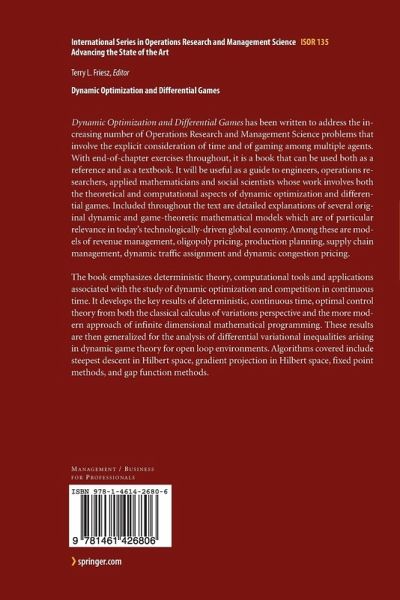 Dynamic Optimization and Differential Games has been written to address the increasing number of Operations Research and Management Science problems that involve the explicit consideration of time and of gaming among multiple agents. With end-of-chapter exercises throughout, it is a book that can be used both as a reference and as a textbook. It will be useful as a guide to engineers, operations researchers, applied mathematicians and social scientists whose work involves both the theoretical and computational aspects of dynamic optimization and differential games. Included throughout the text are detailed explanations of several original dynamic and game-theoretic mathematical models which are of particular relevance in today's technologically-driven-global economy: revenue management, oligopoly pricing, production planning, supply chain management, dynamic traffic assignment and dynamic congestion pricing.