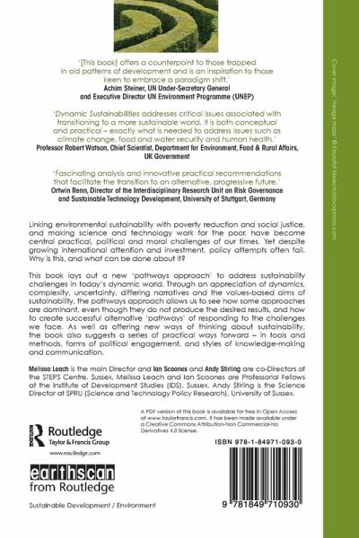 This book lays out a new 'pathways approach' to address sustainability challenges such as these in today's dynamic world. Through an appreciation of dynamics, complexity, uncertainty, differing narratives and the values-based aims of sustainability, the pathways approach allows us to see how some approaches are dominant, even though they do not produce the desired results, and how to create successful alternative 'pathways' of responding to the challenges we face. As well as offering new ways of thinking about sustainability, the book also suggests a series of practical ways forward - in tools and methods, forms of political engagement, and styles of knowledge-making and communication. Throughout the book, the practicalities of the pathways approach are illustrated using four case studies: water in dryland India, agricultural seeds in Africa, responses to epidemic disease and energy systems/climate change. Published in association with the Economic and Social Research Council (ESRC).