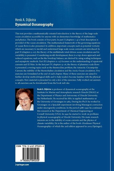 This textbook provides a mathematical introduction to the theory of large-scale ocean circulation and is accessible for readers with an elementary knowledge of mathematics and physics, including continuum mechanics and solution methods for ordinary differential equations. The book consists of four parts. Part I (chapters 1 - 4) is a very brief introduction to ocean circulation and the mathematical formulation of the governing equations of ocean flows. In addition, concepts are introduced that are necessary to describe and understand large-scale ocean currents. In part II (chapters 5 - 10), the…mehr