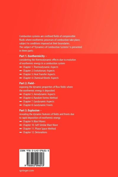 Combustion systems are confined fields of compressible fluids where exothermic processes of combustion take place, subject to boundary conditions imposed at its borders. The subject of Dynamics of Combustion Systems is presented in three parts: Part 1. Exothermicity - considering the thermodynamic effects due to evolution of exothermic energy in a combustion system - Part 2. Field- exposing the dynamic properties of flow fields where the exothermic energy is deposited - Part 3. Explosions - revealing the dynamic features of fields and fronts due to rapid deposition of exothermic energy.