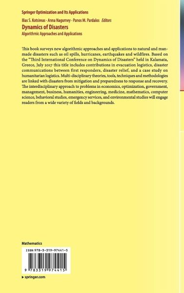 This book surveys new algorithmic approaches and applications to natural and man-made disasters such as oil spills, hurricanes, earthquakes and wildfires. Based on the "Third International Conference on Dynamics of Disasters" held in Kalamata, Greece, July 2017, this Work includes contributions in evacuation logistics, disaster communications between first responders, disaster relief, and a case study on humanitarian logistics. Multi-disciplinary theories, tools, techniques and methodologies are linked with disasters from mitigation and preparedness to response and recovery. The interdisciplinary approach to problems in economics, optimization, government, management, business, humanities, engineering, medicine, mathematics, computer science, behavioral studies, emergency services, and environmental studies will engage readers from a wide variety of fields and backgrounds.