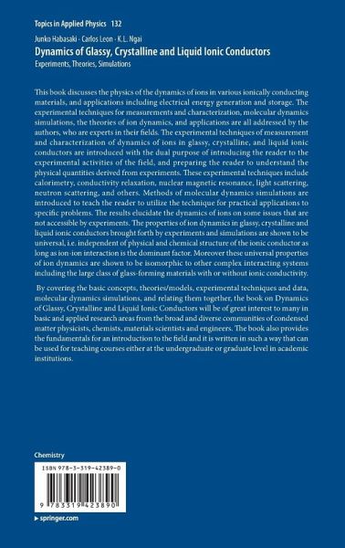 This book discusses the physics of the dynamics of ions in various ionically conducting materials, and applications including electrical energy generation and storage. The experimental techniques for measurements and characterization, molecular dynamics simulations, the theories of ion dynamics, and applications are all addressed by the authors, who are experts in their fields. The experimental techniques of measurement and characterization of dynamics of ions in glassy, crystalline, and liquid ionic conductors are introduced with the dual purpose of introducing the reader to the experimental activities of the field, and preparing the reader to understand the physical quantities derived from experiments. These experimental techniques include calorimetry, conductivity relaxation, nuclear magnetic resonance, light scattering, neutron scattering, and others. Methods of molecular dynamics simulations are introduced to teach the reader to utilize the technique for practical applications to specific problems. The results elucidate the dynamics of ions on some issues that are not accessible by experiments. The properties of ion dynamics in glassy, crystalline and liquid ionic conductors brought forth by experiments and simulations are shown to be universal, i.e. independent of physical and chemical structure of the ionic conductor as long as ion-ion interaction is the dominant factor. Moreover these universal properties of ion dynamics are shown to be isomorphic to other complex interacting systems including the large class of glass-forming materials with or without ionic conductivity.By covering the basic concepts, theories/models, experimental techniques and data, molecular dynamics simulations, and relating them together, Dynamics of Glassy, Crystalline and Liquid Ionic Conductors will be of great interest to many in basic and applied research areas from the broad and diverse communities of condensed matter physicists, chemists, materials scientists and engineers. The book also provides the fundamentals for an introduction to the field and it is written in such a way that can be used for teaching courses either at the undergraduate or graduate level in academic institutions.