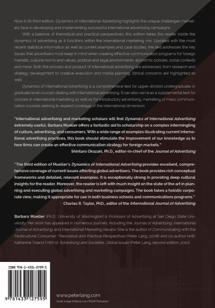 "International advertising and marketing scholars will find "Dynamics of International Advertising" extremely useful. Barbara Mueller offers a fantastic aid to scholarship on a complex intermingling of culture, advertising, and consumers. With a wide range of examples illustrating current international advertising practices, this book should stimulate the improvement of our knowledge as to how firms can create an effective communication strategy for foreign markets."