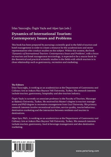 This book has been prepared by pursuing a scientic goal in the eld of tourism and hotel management in order to create a resource for the academicians and sector representatives who conduct studies on the subject. Within this context, the book 'Dynamics of International Tourism: Contemporary Issues and Problems', with a focus on tourism and hotel management terminology, is expected to be a source book for the theoretical and practical scientic studies in the elds with which tourism is in close relationship such as gastronomy, recreation and marketing.