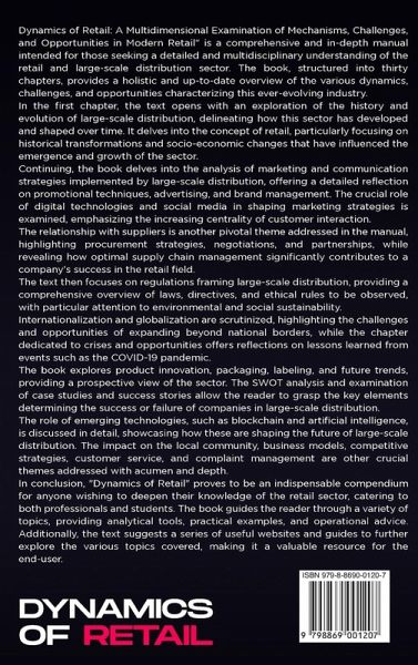 Dynamics of Retail: A Multidimensional Examination of Mechanisms, Challenges, and Opportunities in Modern Retail" is a comprehensive and in-depth manual intended for those seeking a detailed and multidisciplinary understanding of the retail and large-scale distribution sector. The book, structured into thirty chapters, provides a holistic and up-to-date overview of the various dynamics, challenges, and opportunities characterizing this ever-evolving industry. In the first chapter, the text opens with an exploration of the history and evolution of large-scale distribution, delineating how this sector has developed and shaped over time. It delves into the concept of retail, particularly focusing on historical transformations and socio-economic changes that have influenced the emergence and growth of the sector. Continuing, the book delves into the analysis of marketing and communication strategies implemented by large-scale distribution, offering a detailed reflection on promotional techniques, advertising, and brand management. The crucial role of digital technologies and social media in shaping marketing strategies is examined, emphasizing the increasing centrality of customer interaction. The relationship with suppliers is another pivotal theme addressed in the manual, highlighting procurement strategies, negotiations, and partnerships, while revealing how optimal supply chain management significantly contributes to a company's success in the retail field. The text then focuses on regulations framing large-scale distribution, providing a comprehensive overview of laws, directives, and ethical rules to be observed, with particular attention to environmental and social sustainability. Internationalization and globalization are scrutinized, highlighting the challenges and opportunities of expanding beyond national borders, while the chapter dedicated to crises and opportunities offers reflections on lessons learned from events such as the COVID-19 pandemic. The book explores product innovation, packaging, labeling, and future trends, providing a prospective view of the sector. The SWOT analysis and examination of case studies and success stories allow the reader to grasp the key elements determining the success or failure of companies in large-scale distribution. The role of emerging technologies, such as blockchain and artificial intelligence, is discussed in detail, showcasing how these are shaping the future of large-scale distribution. The impact on the local community, business models, competitive strategies, customer service, and complaint management are other crucial themes addressed with acumen and depth. In conclusion, "Dynamics of Retail" proves to be an indispensable compendium for anyone wishing to deepen their knowledge of the retail sector, catering to both professionals and students. The book guides the reader through a variety of topics, providing analytical tools, practical examples, and operational advice. Additionally, the text suggests a series of useful websites and guides to further explore the various topics covered, making it a valuable resource for the end-user.