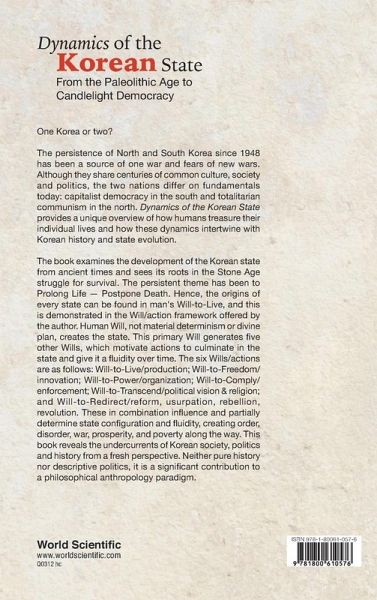 One Korea or two? The persistence of North and South Korea since 1948 has been a source of one war and fears of new wars. Although they share centuries of common culture, society and politics, the two nations differ on fundamentals today: capitalist democracy in the south and totalitarian communism in the north. Dynamics of the Korean State provides a unique overview of how humans treasure their individual lives and how these dynamics intertwine with Korean history and state evolution. The book examines the development of the Korean state from ancient times and sees its roots in the Stone Age struggle for survival. The persistent theme has been to Prolong Life - Postpone Death. Hence, the origins of every state can be found in man's Will-to-Live, and this is demonstrated in the Will/action framework offered by the author. Human Will, not material determinism or divine plan, creates the state. This primary Will generates five other Wills, which motivate actions to culminate in the state and give it a fluidity over time. The six Wills/actions are as follows: Will-to-Live/production; Will-to-Freedom/innovation; Will-to-Power/organization; Will-to-Comply/enforcement; Will-to-Transcend/political vision & religion; and Will-to-Redirect/reform, usurpation, rebellion, revolution. These in combination influence and partially determine state configuration and fluidity, creating order, disorder, war, prosperity, and poverty along the way. This book reveals the undercurrents of Korean society, politics and history from a fresh perspective. Neither pure history nor descriptive politics, it is a significant contribution to a philosophical anthropology paradigm.