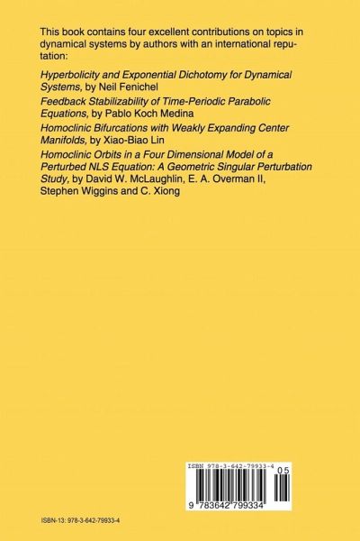 DYNAMICS REPORTED reports on recent developments in dynamical systems. Dynamical systems of course originated from ordinary differential equations. Today, dynamical systems cover a much larger area, including dynamical processes described by functional and integral equations, by partial and stochastic differential equations, etc. Dynamical systems have involved remarkably in recent years. A wealth of new phenomena, new ideas and new techniques are proving to be of considerable interest to scientists in rather different fields. It is not surprising that thousands of publications on the theory itself and on its various applications are appearing DYNAMICS REPORTED presents carefully written articles on major subjects in dynam ical systems and their applications, addressed not only to specialists but also to a broader range of readers including graduate students. Topics are advanced, while detailed expo sition of ideas, restriction to typical results - rather than the most general ones - and, last but not least, lucid proofs help to gain the utmost degree of clarity. It is hoped, that DYNAMICS REPORTED will be useful for those entering the field and will stimulate an exchange of ideas among those working in dynamical systems Summer 1991 Christopher K. R. T Jones Drs Kirchgraber Hans-Otto Walther Managing Editors Table of Contents Hyperbolicity and Exponential Dichotomy for Dynamical Systems Neil Fenichel 1. Introduction . . . . . . . . . . . . . . . . . . I 2. The Main Lemma . . . . . . . . . . . . . . . . 2 3. The Linearization Theorem of Hartman and Grobman 5 4. Hyperbolic Invariant Sets: EUR-orbits and Stable Manifolds 6 5.