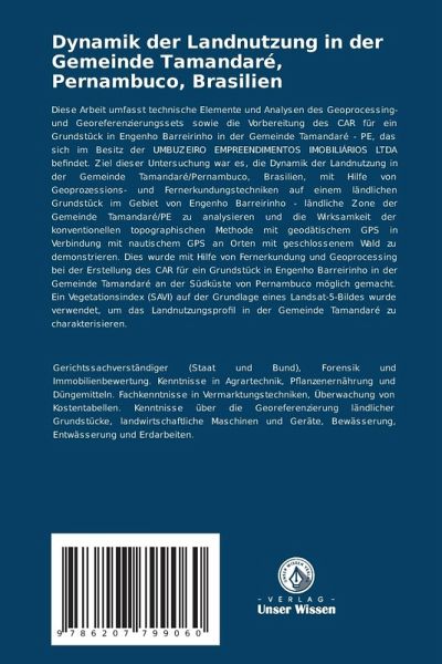 Diese Arbeit umfasst technische Elemente und Analysen des Geoprocessing- und Georeferenzierungssets sowie die Vorbereitung des CAR für ein Grundstück in Engenho Barreirinho in der Gemeinde Tamandaré - PE, das sich im Besitz der UMBUZEIRO EMPREENDIMENTOS IMOBILIÁRIOS LTDA befindet. Ziel dieser Untersuchung war es, die Dynamik der Landnutzung in der Gemeinde Tamandaré/Pernambuco, Brasilien, mit Hilfe von Geoprozessions- und Fernerkundungstechniken auf einem ländlichen Grundstück im Gebiet von Engenho Barreirinho - ländliche Zone der Gemeinde Tamandaré/PE zu analysieren und die Wirksamkeit der konventionellen topographischen Methode mit geodätischem GPS in Verbindung mit nautischem GPS an Orten mit geschlossenem Wald zu demonstrieren. Dies wurde mit Hilfe von Fernerkundung und Geoprocessing bei der Erstellung des CAR für ein Grundstück in Engenho Barreirinho in der Gemeinde Tamandaré an der Südküste von Pernambuco möglich gemacht. Ein Vegetationsindex (SAVI) auf der Grundlage eines Landsat-5-Bildes wurde verwendet, um das Landnutzungsprofil in der Gemeinde Tamandaré zu charakterisieren.
