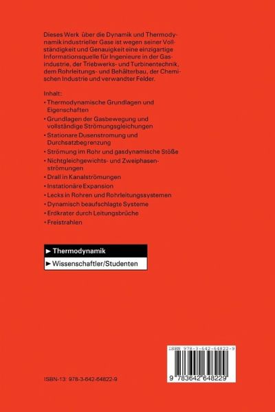 Dieses Werk über die Dynamik und Thermodynamik industrieller Gase ist wegen seiner Vollständigkeit und Genauigkeit eine einzigartige Informationsquelle für Ingenieure in der Gasindustrie, der Triebwerks- und Turbinentechnik, dem Rohrleitungs -und Behälterbau, der chemischen Industrie und verwandter Felder.
