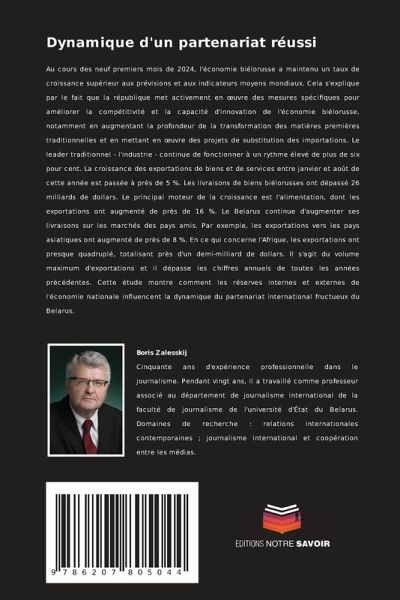 Au cours des neuf premiers mois de 2024, l'économie biélorusse a maintenu un taux de croissance supérieur aux prévisions et aux indicateurs moyens mondiaux. Cela s'explique par le fait que la république met activement en oeuvre des mesures spécifiques pour améliorer la compétitivité et la capacité d'innovation de l'économie biélorusse, notamment en augmentant la profondeur de la transformation des matières premières traditionnelles et en mettant en oeuvre des projets de substitution des importations. Le leader traditionnel - l'industrie - continue de fonctionner à un rythme élevé de plus de six pour cent. La croissance des exportations de biens et de services entre janvier et août de cette année est passée à près de 5 %. Les livraisons de biens biélorusses ont dépassé 26 milliards de dollars. Le principal moteur de la croissance est l'alimentation, dont les exportations ont augmenté de près de 16 %. Le Belarus continue d'augmenter ses livraisons sur les marchés des pays amis. Par exemple, les exportations vers les pays asiatiques ont augmenté de près de 8 %. En ce qui concerne l'Afrique, les exportations ont presque quadruplé, totalisant près d'un demi-milliard de dollars. Il s'agit du volume maximum d'exportations et il dépasse les chiffres annuels de toutes les années précédentes. Cette étude montre comment les réserves internes et externes de l'économie nationale influencent la dynamique du partenariat international fructueux du Belarus.