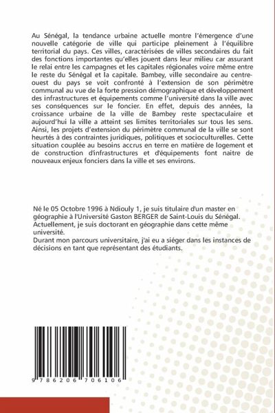 Au Sénégal, la tendance urbaine actuelle montre l'émergence d'une nouvelle catégorie de ville qui participe pleinement à l'équilibre territorial du pays. Ces villes, caractérisées de villes secondaires du fait des fonctions importantes qu'elles jouent dans leur milieu car assurant le relai entre les campagnes et les capitales régionales voire même entre le reste du Sénégal et la capitale. Bambey, ville secondaire au centre-ouest du pays se voit confronté à l'extension de son périmètre communal au vue de la forte pression démographique et développement des infrastructures et équipements comme l'université dans la ville avec ses conséquences sur le foncier. En effet, depuis des années, la croissance urbaine de la ville de Bambey reste spectaculaire et aujourd'hui la ville a atteint ses limites territoriales sur tous les sens. Ainsi, les projets d'extension du périmètre communal de la ville se sont heurtés à des contraintes juridiques, politiques et socioculturelles. Cette situation couplée au besoins accrus en terre en matière de logement et de construction d'infrastructures et d'équipements font naitre de nouveaux enjeux fonciers dans la ville et ses environs.