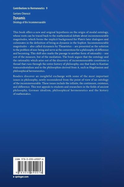 This book offers a new and original hypothesis on the origin of modal ontology, whose roots can be traced back to the mathematical debate about incommensurable magnitudes, which forms the implicit background for Plato's later dialogues and culminates in the definition of being as dynamis in the Sophist. Incommensurable magnitudes - also called dynameis by Theaetetus - are presented as the solution to the problem of non-being and serve as the cornerstone for a philosophy of difference and becoming. This shift also marks the passage to another form of rationality - one not of the measure, but of the mediation. The book argues that the ontology and the rationality which arise out of the discovery of incommensurable constitutes a thread that runs through the entire history of philosophy, one that leads to Kantian transcendentalism and to the philosophies derived from it, such as Hegelianism and philosophical hermeneutics. Readers discover an insightful exchange with some of the most important issues in philosophy, newly reconsidered from the point of view of an ontology of the incommensurable. These issues include the infinite, the continuum, existence, and difference. This text appeals to students and researchers in the fields of ancient philosophy, German idealism, philosophical hermeneutics and the history of mathematics.