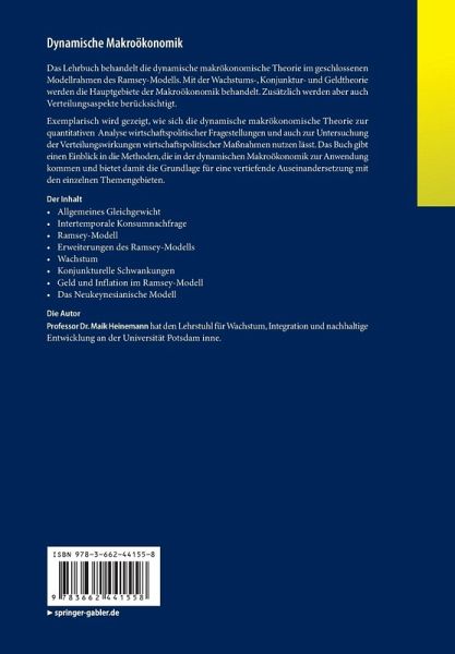 Das Lehrbuch behandelt die dynamische makrökonomische Theorie im geschlossenen Modellrahmen des Ramsey-Modells. Mit der Wachstums-, Konjunktur- und Geldtheorie werden die Hauptgebiete der Makroökonomik behandelt. Zusätzlich werden aber auch Verteilungsaspekte berücksichtigt. Exemplarisch wird gezeigt, wie sich die dynamische makrökonomische Theorie zur quantitativen Analyse wirtschaftspolitischer Fragestellungen und auch zur Untersuchung der Verteilungswirkungen wirtschaftspolitischer Maßnahmen nutzen lässt. Das Buch gibt einen Einblick in die Methoden, die in der dynamischen Makroökonomik zur Anwendung kommen und bietet damit die Grundlage für eine vertiefende Auseinandersetzung mit den einzelnen Themengebieten.