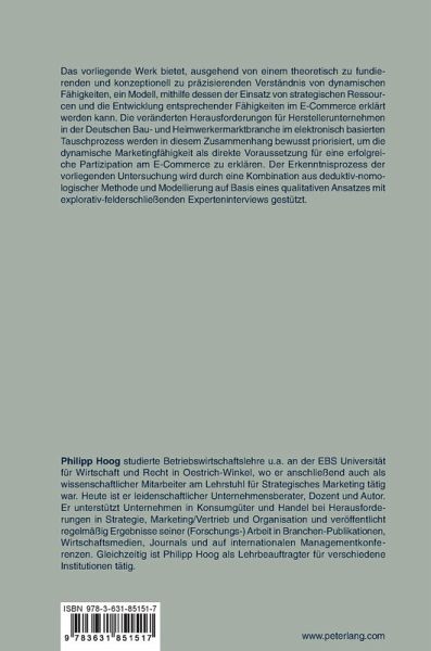 Das vorliegende Werk bietet, ausgehend von einem theoretisch zu fundierenden und konzeptionell zu präzisierendem Verständnis von dynamischen Fähigkeiten, ein Modell, mithilfe dessen der Einsatz von strategischen Ressourcen und die Entwicklung entsprechender Fähigkeiten im E-Commerce erklärt werden kann. Die veränderten Herausforderungen für Herstellerunternehmen in der Deutschen Bau- und Heimwerkermarktbranche im elektronisch basierten Tauschprozess werden in diesem Zusammenhang bewusst priorisiert, um die dynamische Marketingfähigkeit als direkte Voraussetzung für eine erfolgreiche Partizipation am E-Commerce zu erklären. Der Erkenntnisprozess der vorliegenden Untersuchung wird durch eine Kombination aus deduktiv-nomologischer Methode und Modellierung auf Basis eines qualitativen Ansatzes mit explorativ-felderschließenden Experteninterviews gestützt.