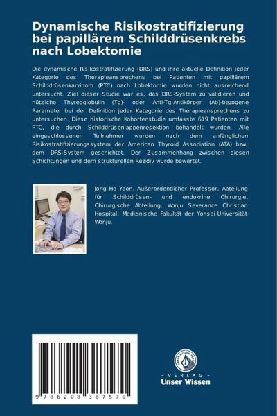 Die dynamische Risikostratifizierung (DRS) und ihre aktuelle Definition jeder Kategorie des Therapieansprechens bei Patienten mit papillärem Schilddrüsenkarzinom (PTC) nach Lobektomie wurden nicht ausreichend untersucht. Ziel dieser Studie war es, das DRS-System zu validieren und nützliche Thyreoglobulin (Tg)- oder Anti-Tg-Antikörper (Ab)-bezogene Parameter bei der Definition jeder Kategorie des Therapieansprechens zu untersuchen. Diese historische Kohortenstudie umfasste 619 Patienten mit PTC, die durch Schilddrüsenlappenresektion behandelt wurden. Alle eingeschlossenen Teilnehmer wurden nach dem anfänglichen Risikostratifizierungssystem der American Thyroid Association (ATA) bzw. dem DRS-System geschichtet. Der Zusammenhang zwischen diesen Schichtungen und dem strukturellen Rezidiv wurde bewertet.