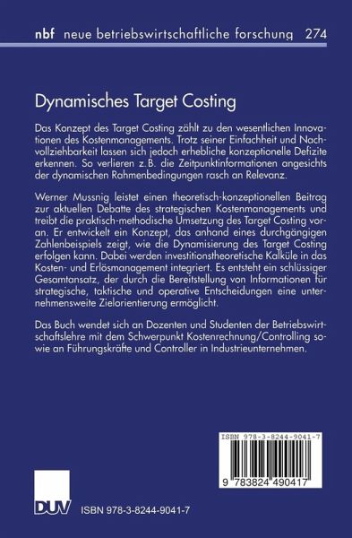 Werner Mussnig leistet einen theoretisch-konzeptionellen Beitrag zur aktuellen Debatte des strategischen Kostenmanagements und treibt die praktisch-methodische Umsetzung des Target Costing voran. Er entwickelt ein Konzept, das anhand eines durchgängigen Zahlenbeispiels zeigt, wie die Dynamisierung des Target Costing erfolgen kann. Dabei werden investitionstheoretische Kalküle in das Kosten- und Erlösmanagement integriert. Es entsteht ein schlüssiger Gesamtansatz, der durch die Bereitstellung von Informationen für strategische, taktische und operative Entscheidungen eine unternehmensweite Zielorientierung ermöglicht.