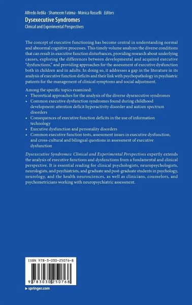 The concept of executive functioning has become central in understanding normal and abnormal cognitive processes. This timely volume analyzes the diverse conditions that can result in executive function disturbances, providing research about underlying causes, exploring the differences between developmental and acquired executive "dysfunctions," and providing approaches for the assessment of executive dysfunction both in children and in adults. In doing so, it addresses a gap in the literature in its analysis of executive function deficits and their link with psychopathology in psychiatric patients for the management of clinical symptoms and social adjustment.