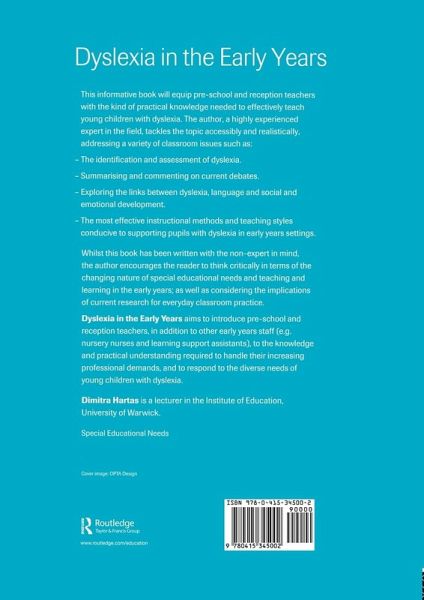 Packed full of activities, real-life case studies, tasks and suggestions, this informative book will equip teachers with the kind of practical knowledge needed to teach young children with dyslexia effectively. Tackling the subject in a clear and realistic way, the author encourages teachers to think critically in terms of the changing nature of special educational needs, and teaching and learning in early years. She addresses a variety of classroom issues, such as: assessment and identification of dyslexia summarising and commenting on current debates exploring the links between dyslexia, language, and social and emotional development the most effective instructional methods and teaching styles conducive to supporting pupils with dyslexia in early years settings. In addition the book considers the implications of current research for everyday classroom practice, makes recommendations for employing technologies and for accessing web-based information and resources.