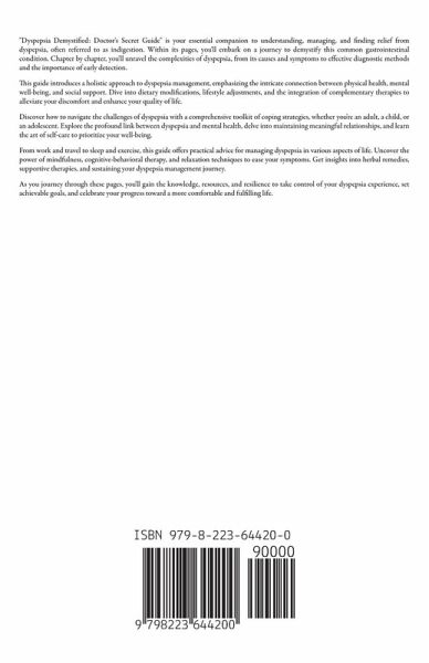 "Dyspepsia Demystified: Doctor's Secret Guide" is your essential companion to understanding, managing, and finding relief from dyspepsia, often referred to as indigestion. Within its pages, you'll embark on a journey to demystify this common gastrointestinal condition. Chapter by chapter, you'll unravel the complexities of dyspepsia, from its causes and symptoms to effective diagnostic methods and the importance of early detection. This guide introduces a holistic approach to dyspepsia management, emphasizing the intricate connection between physical health, mental well-being, and social support. Dive into dietary modifications, lifestyle adjustments, and the integration of complementary therapies to alleviate your discomfort and enhance your quality of life. Discover how to navigate the challenges of dyspepsia with a comprehensive toolkit of coping strategies, whether you're an adult, a child, or an adolescent. Explore the profound link between dyspepsia and mental health, delve into maintaining meaningful relationships, and learn the art of self-care to prioritize your well-being. From work and travel to sleep and exercise, this guide offers practical advice for managing dyspepsia in various aspects of life. Uncover the power of mindfulness, cognitive-behavioral therapy, and relaxation techniques to ease your symptoms. Get insights into herbal remedies, supportive therapies, and sustaining your dyspepsia management journey. As you journey through these pages, you'll gain the knowledge, resources, and resilience to take control of your dyspepsia experience, set achievable goals, and celebrate your progress toward a more comfortable and fulfilling life.