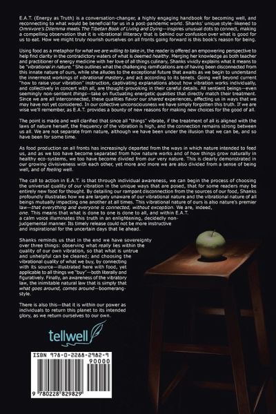 E.A.T. (Energy as Truth) is a conversation-changer, a highly engaging handbook for becoming well, and reconnecting to what would be beneficial for us in a post-pandemic world. Shanks' unique style-likened to Omnivore's Dilemma meets The Tibetan Book of Living and Dying-inspires unusual dots to connect, making a compelling observation that it is vibrational illiteracy that is behind our confusion over what is good for us to eat. How we might truly nourish ourselves on all fronts going forward is this book's reason for being. Using food as a metaphor for what we are willing to take in, the reader is offered an empowering perspective to help find clarity in the contradictory waters of what is deemed healthy. Merging her knowledge as both teacher and practitioner of energy medicine with her love of all things culinary, Shanks vividly explains what it means to be "vibrational in nature." She outlines what the challenging ramifications are of having been disconnected from this innate nature of ours, while she alludes to the exceptional future that awaits as we begin to understand the innermost workings of vibrational mastery, and act according to its tenets. Going well beyond current "how to raise your vibration" instruction, captivating explanations about how vibration works individually, and collectively in concert with all, are thought-provoking in their careful details. All sentient beings-even seemingly non-sentient things-take on fluctuating energetic qualities that directly match their treatment. Since we are all interconnected, these qualities flavor our shared experiences, affecting us in ways that we may have not yet considered. In our collective unconsciousness we have simply forgotten this truth. If we are wise we'll remember, as E.A.T. provides a bounty of new reasons for making new choices for the good of all. The point is made and well clarified that since all "things" vibrate, if the treatment of all is aligned with the laws of nature herself, the frequency of the vibration is high, and the connection remains strong between us all. We are not separate from nature, although we have been under the illusion that we can be, and so have been for some time. As food production on all fronts has increasingly departed from the ways in which nature intended to feed us, and as we too have become separated from how nature works and of how things grow naturally in healthy eco-systems, we too have become divided from our very nature. This is clearly demonstrated in our growing divisiveness with each other, yet more and more we are also divided from a sense of being well, and of feeling well. The call to action in E.A.T. is that through individual awareness, we can begin the process of choosing the universal quality of our vibration in the unique ways that are posed, that for some readers may be entirely new food for thought. By detailing our rampant disconnection from the sources of our food, Shanks profoundly illustrates how we are largely unaware of our vibrational nature and the vibrational nature of all beings mutually impacting one another at all times. This vibrational nature of ours is also nature's premier law-that everything and everyone is connected, without exception. We are, indeed, one. This means that what is done to one is done to all, and within E.A.T. a calm voice illuminates this truth in an enlightening, decidedly nonjudgemental manner. Its timely release could not be more instructive and inspirational for the uncertain days that lie ahead.