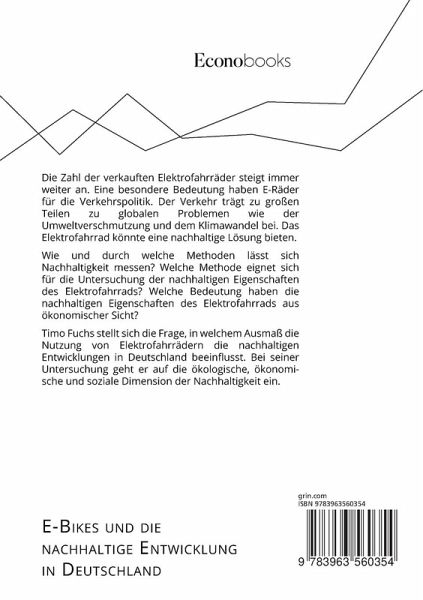 Die Zahl der verkauften Elektrofahrräder steigt immer weiter an. Eine besondere Bedeutung haben E-Räder für die Verkehrspolitik. Der Verkehr trägt zu großen Teilen zu globalen Problemen wie der Umweltverschmutzung und dem Klimawandel bei. Das Elektrofahrrad könnte eine nachhaltige Lösung bieten. Wie und durch welche Methoden lässt sich Nachhaltigkeit messen? Welche Methode eignet sich für die Untersuchung der nachhaltigen Eigenschaften des Elektrofahrrads? Welche Bedeutung haben die nachhaltigen Eigenschaften des Elektrofahrrads aus ökonomischer Sicht?Timo Fuchs stellt sich die Frage, in welchem Ausmaß die Nutzung von Elektrofahrrädern die nachhaltigen Entwicklungen in Deutschland beeinflusst. Bei seiner Untersuchung geht er auf die ökologische, ökonomische und soziale Dimension der Nachhaltigkeit ein. Aus dem Inhalt:-Ökobilanz;-Umweltschutz;-Lebenszyklusanalyse;-Sozialbilanz;-Pedelec;-Mobilität