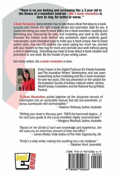 "There is no use kicking and screaming like a 2 year old in the throes of a marathon tantrum - the e-book revolution is here to stay, for better or worse. " 'E-book Revolution' demonstrates how to take those critical first steps to e-book success and choose the right e-book model and promotion style for you. It covers everything you need to know about the e-book revolution, readying and formatting your manuscript for sale, and marketing your work to the world. Discover the hidden truth behind why publishers reject perfectly good manuscripts. Learn innovative ways to make your e-book unique, how to boost author sales, how non-US authors can avoid paying too much tax, connect with your readers so they beg for more and promote your work without paying a cent in advertising. Everything you need to know about e-book creation and promotion in one book. Be the master of your writing career. Get ready writers, the e-book revolution is here. Emily Craven is the Digital Producer for If:Book Australia and The Australian Writers' Marketplace and has been researching author marketing and the e-book revolution for over two years. She has presented on the subject for the Australian Society of Authors, national writers' centres, World Fantasy Convention and the National Young Writers Festival. "E-Book Revolution pulled together all the disparate kernels of information into an accessible manual that did not overwhelm, or worse, bamboozle with technobabble." ~Rowena Holloway, Author, Australia "Writing your novel is the easy part - THEN the hard work begins... A fun and pacy guide to the e-pub minefield. Highly recommended." ~ Morgana Macleod, Author, Australia "Based on her [Emily's] hard won knowledge and experience, she will save you an enormous amount of time and effort." ~James Minter, Indie Author of The Hole Opportunity, UK. "Emily's a witty writer, making this anything but a dry textbook." ~ Stephen Hunt, Journalist.