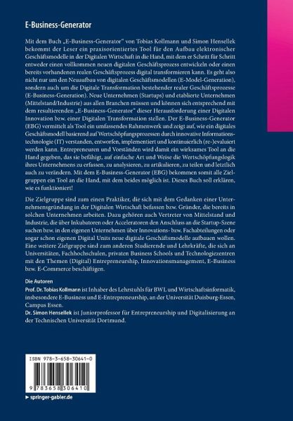 Mit dem Buch "E-Business-Generator" von Tobias Kollmann und Simon Hensellek bekommt der Leser ein praxisorientiertes Tool für den Aufbau elektronischer Geschäftsmodelle in der Digitalen Wirtschaft in die Hand, mit dem er Schritt für Schritt entweder einen vollkommen neuen digitalen Geschäftsprozess entwickeln oder einen bereits vorhandenen realen Geschäftsprozess digital transformieren kann. Es geht also nicht nur um den Neuaufbau von digitalen Geschäftsmodellen (E-Model-Generation), sondern auch um die Digitale Transformation bestehender realer Geschäftsprozesse (E-Business-Generation). Neue Unternehmen (Startups) und etablierte Unternehmen (Mittelstand/Industrie) aus allen Branchen müssen und können sich entsprechend mit dem resultierenden "E-Business-Generator" dieser Herausforderung einer Digitalen Innovation bzw. einer Digitalen Transformation stellen. Der E-Business-Generator (EBG) vermittelt als Tool ein umfassendes Rahmenwerk und zeigt auf, wie ein digitales Geschäftsmodell basierend auf Wertschöpfungsprozessen durch innovative Informationstechnologie (IT) verstanden, entworfen, implementiert und kontinuierlich (re-)evaluiert werden kann. Entrepreneuren und Vorständen wird damit ein wirksames Tool an die Hand gegeben, das sie befähigt, auf einfache Art und Weise die Wertschöpfungslogik ihres Unternehmens zu erfassen, zu analysieren, zu artikulieren, zu teilen und letztlich auch zu verändern. Mit dem E-Business-Generator (EBG) bekommen somit alle Zielgruppen ein Tool an die Hand, mit dem beides möglich ist. Dieses Buch soll erklären, wie es funktioniert!